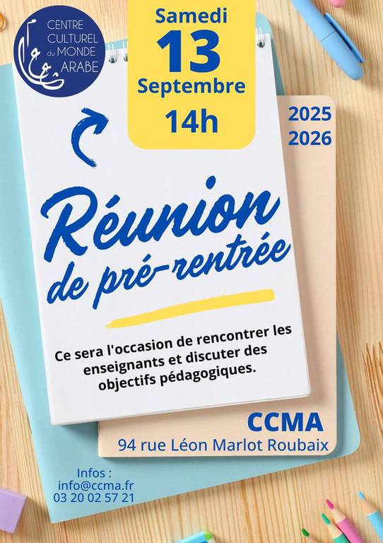 - Réunion de pré-rentrée du CCMA à 14h (94 rue Léon Marlot, Roubaix) – un moment privilégié pour rencontrer nos enseignants et échanger sur les objectifs pédagogiques de l’année 2025-2026.