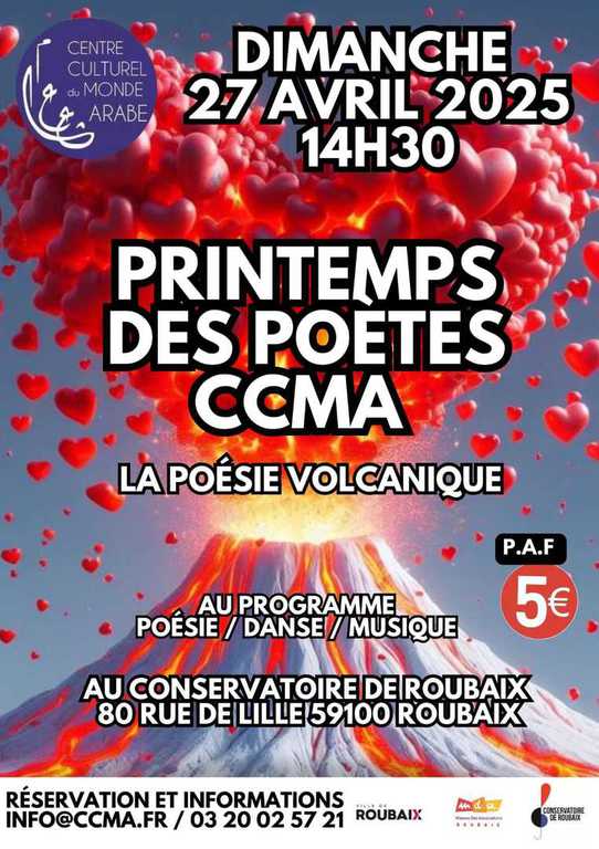 Cher(e)s adhérent(e)s, réservez une place dans votre agenda pour l'un des événements les plus appréciés du CCMA : le "Printemps des Poètes". Il aura lieu le dimanche 27 avril 2025 à 15h au Conservatoire de Roubaix, 80 rue de Lille 59100 Roubaix.