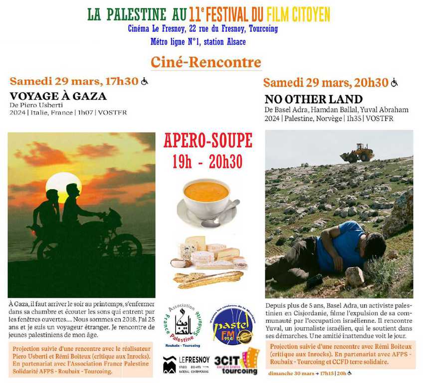 Au programme : Films "Voyage à Gaza" (à 17h30) et "No Other Land" (à 20h30). Projections suivies de débats. Entracte Apero-Soupe.