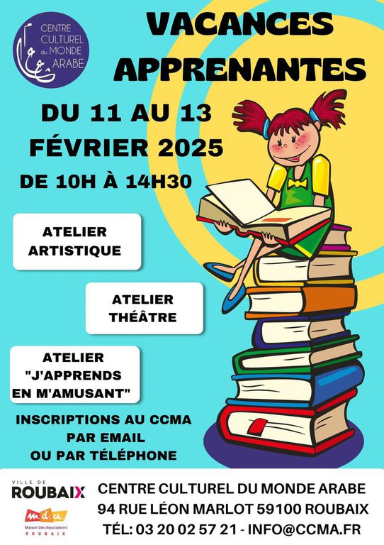 Cher(e)s adhérent(e)s, le Centre Culturel du Monde Arabe vous propose 3 jours de soutien scolaire, du mardi 11 au jeudi 13 février 2025, de 10h à 14h30. Vos enfants pourront non seulement bénéficier d’un accompagnement scolaire, mais aussi participer à des ateliers ludiques et artistiques. Un moment de partage enrichissant et épanouissant garanti !