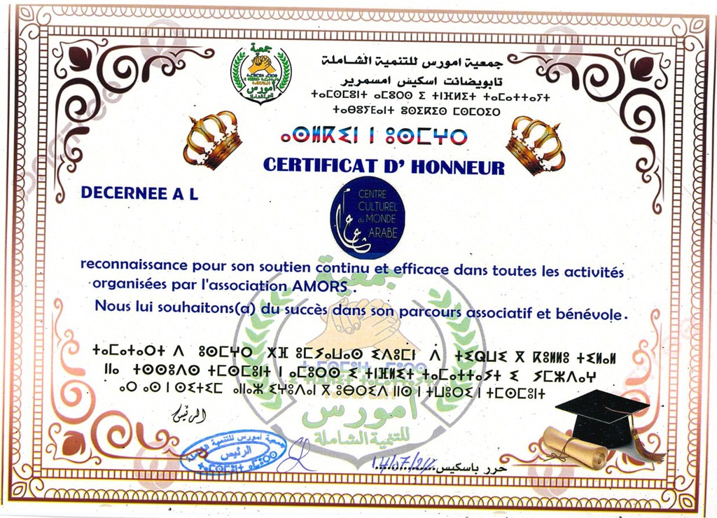 Nous sommes fiers d’annoncer que le Centre Culturel du Monde Arabe a été honoré d’un Certificat d’Honneur en reconnaissance de son engagement et de son soutien à l’association AMORS lors du tremblement de terre à Marrakech et ses alentours survenu le 8 septembre 2023.